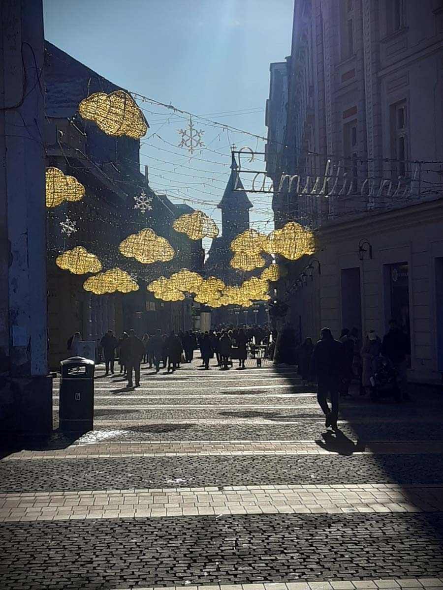 Bright yellow clouds currently hang over Alba Iulia Street, where colorful umbrellas normally line the street in summer.