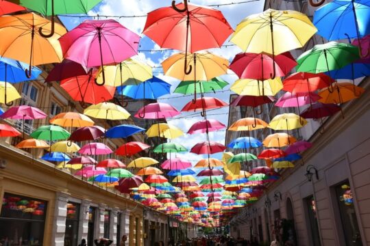 Les parapluies colorés de la Strada Alba Iulia à Timișoara font partie d’une installation artistique qui transforme l’espace public. En plus d’offrir de l’ombre, ils remplissent la rue de vie et de couleurs, la transformant en une œuvre d’art vivante. L’installation est devenue un lieu de photographie très prisé et ajoute au charme unique du centre-ville.