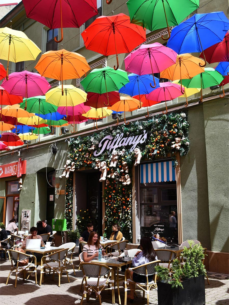 Dans la zone piétonne de la rue Alba Iulia à Timisoara, des parapluies colorés créent une atmosphère particulière pendant la saison estivale. Dans cette même rue se trouve également Cuina Bunicii, un restaurant qui propose une sélection de plats délicieux, préparés à partir d’ingrédients naturels de grande qualité.